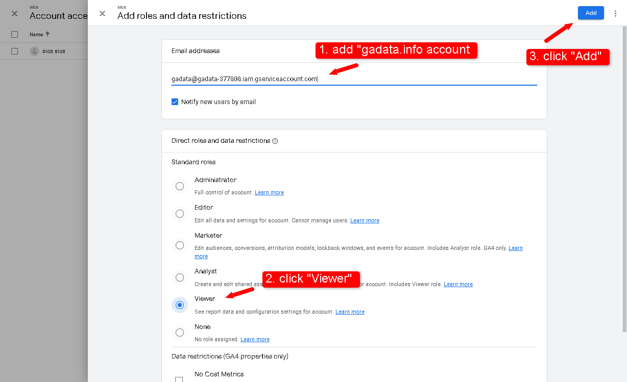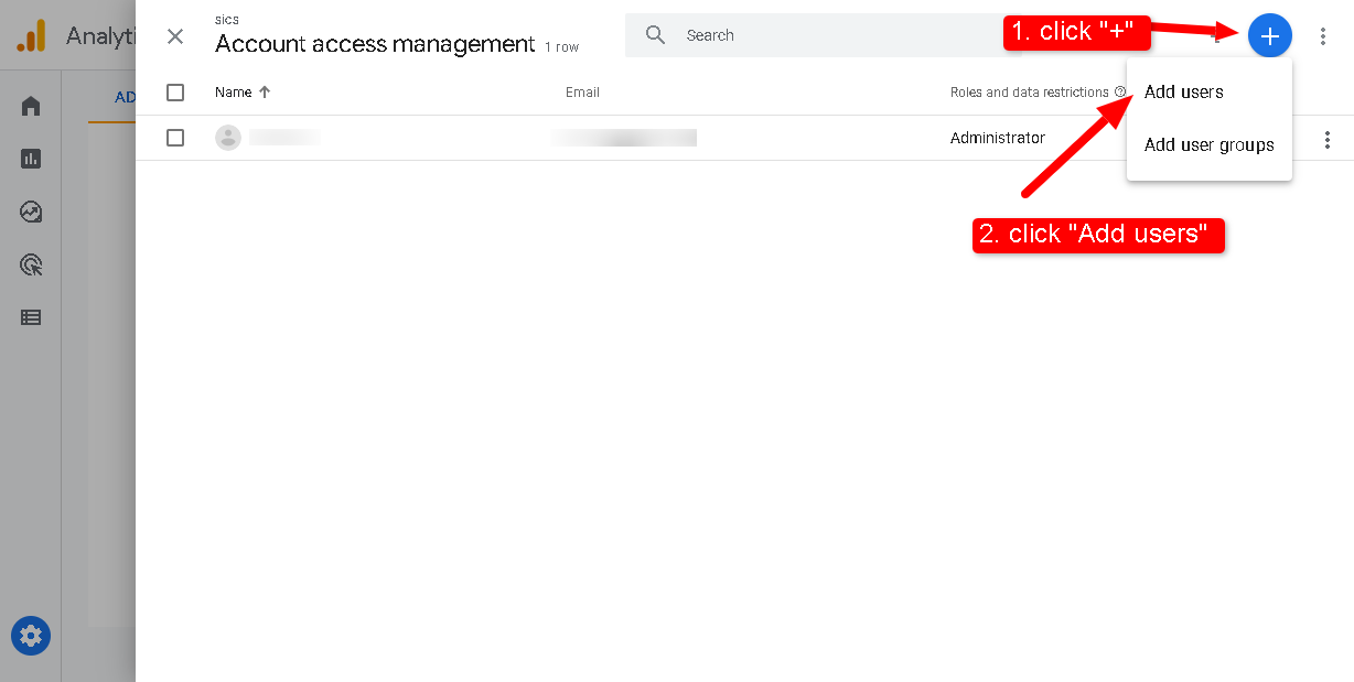 Google Analytics > Admin > Account Access Management > '+' > Add users > Email address '[email protected]' > Add.